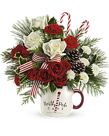 Warm their hearts with this spirited holiday bouquet, arranged in a hand-painted, delightfully oversized mug from the North Pole Café! It’s food safe for years of seasonal sipping delight.